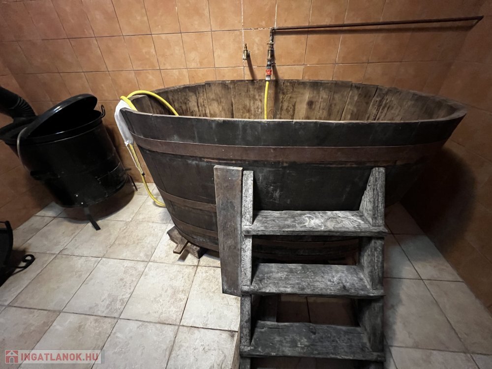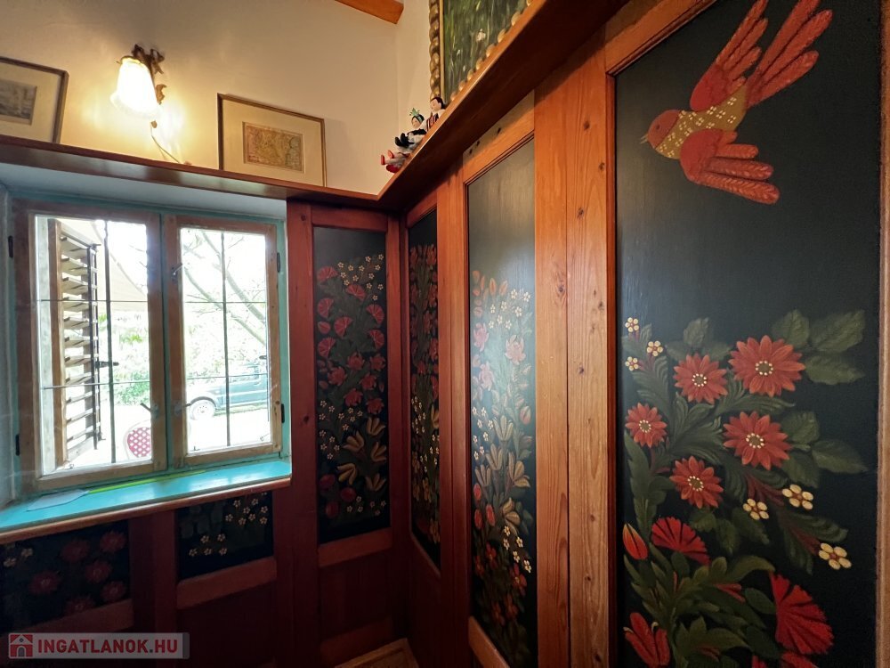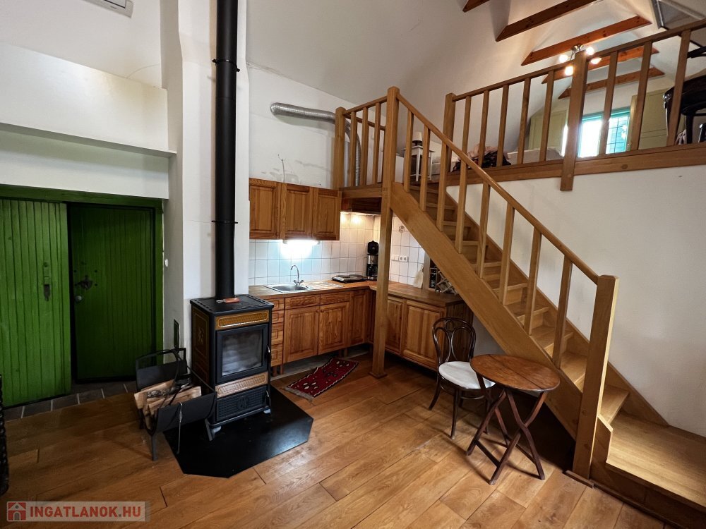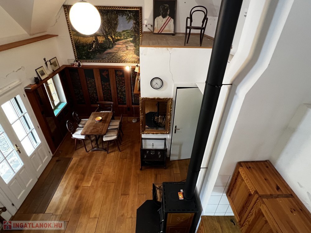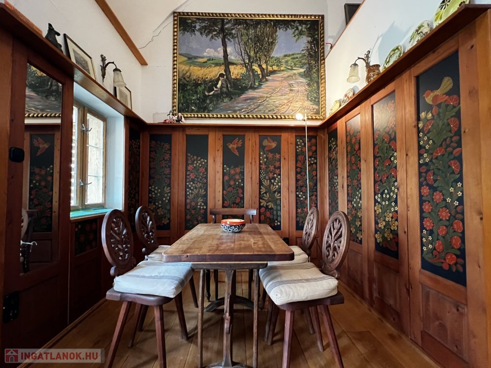 Földszint: tágas nappali-étkező-konyha cserépkályhával és sparhelttel, eredeti, 160 éves látszó gerendákkal és tölgyfa padlóval.