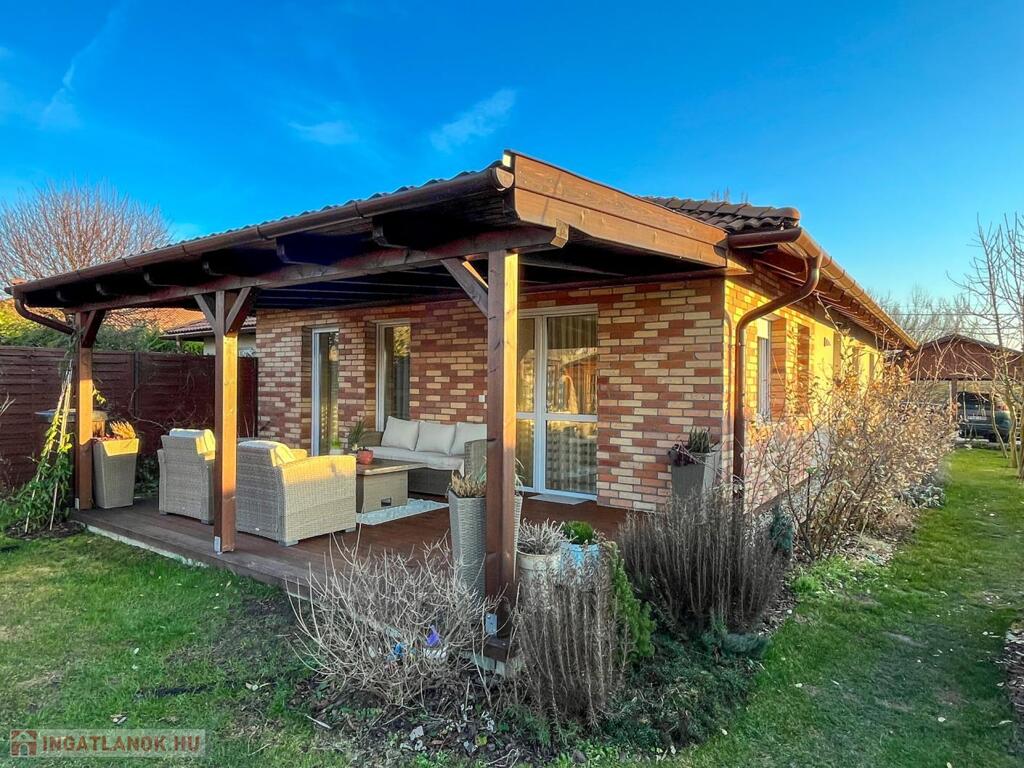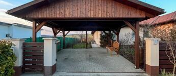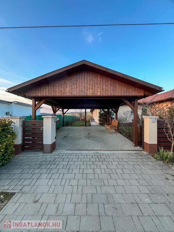 • PARKOLÁS ÉS TÁROLÁS: A parkosított udvaron egy térkövezett, borovi fenyőből készült, cseréplemez fedésű FEDETT GÉPKOCSIBEÁLLÓ védi az autót, a kerti holmiknak pedig egy 9 NM-ES TÁROLÓ nyújt helyet.