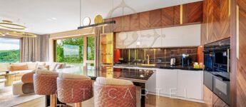 Központi tere a több mint 60 nm-es DNy-i panorámás nappali–konyha–étkező, amely a 43 nm-es panorámaterasszal egybenyitható, így a belső és külső terek között tökéletes átmenet jön létre.
