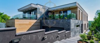 A külső megjelenés minimalista, mégis karakteres: a homlokzatot fekete kőfurnér és fahatású kerámialapok alkotnak elegáns kontrasztot, a rejtett üvegkorlátok pedig még inkább kiemelik a kortárs architektúrát.