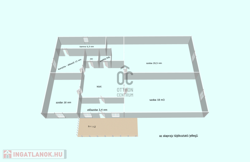 Az épületben három tágas, világos szoba, konyha-étkező, kamra, fürdőszoba masszázszuhannyal, külön wc, közlekedő és egy előtér kapott helyet.