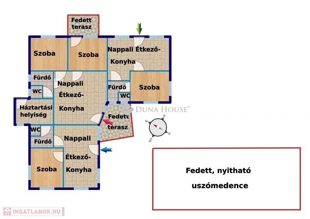 A vendégfogadásra kialakított mediterrán stílusú házban 3 külön bejáratú apartman foglal helyet, amelyikből kettő amerikai konyhás nappalival, fürdő + külön WC-vel, egy hálószobával és egy darab két hálószobás apartman. Kívülről kapcsolódik hozzá egy háztartási helyiség is.