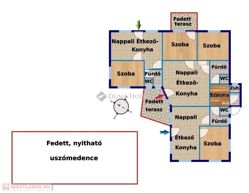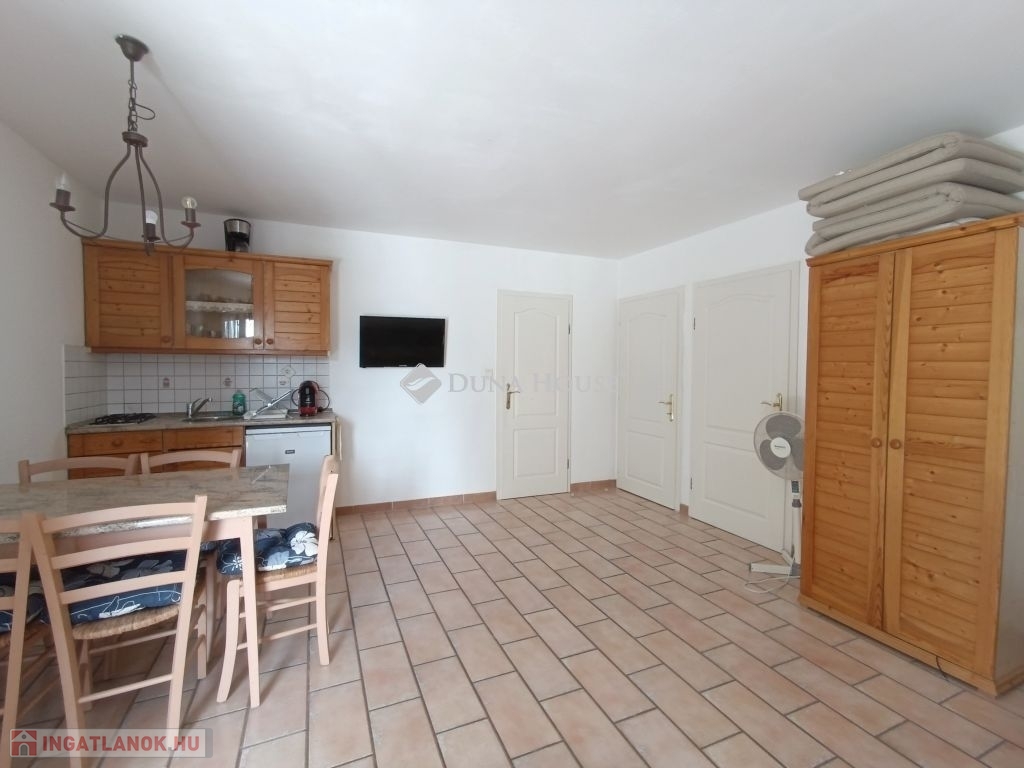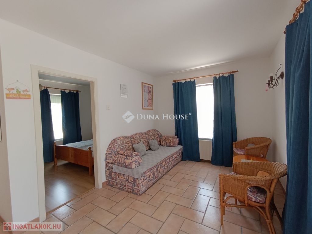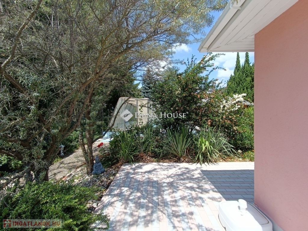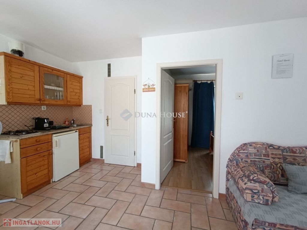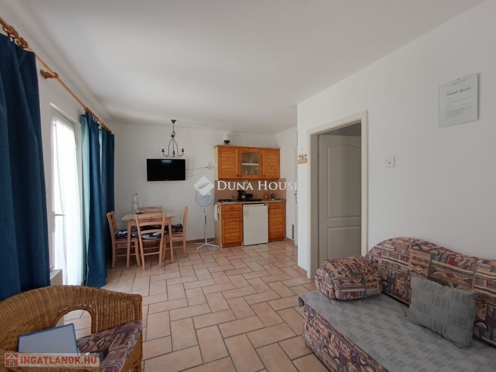Itt 2 egymás melletti telken, két majdnem teljesen egyforma apartmanház fekszik, mindkettő eladó külön-külön, de egyben is. A vendégfogadásra kialakított mediterrán stílusú házban 3 külön bejáratú apartman foglal helyet, amelyikből kettő amerikai konyhás nappalival, fürdő + külön WC-vel, egy hálószobával és egy darab két hálószobás apartman. Kívülről kapcsolódik hozzá egy szauna zuhanyzóval. Az ingatlant egy kis utcából meg lehet közelíteni, ahol a gépkocsiknak van parkolási lehetőség. Az apartmanházat mediterrán stílusú sziklakert veszi körül virágokkal és fákkal, ahol egy fa pavilon, kiülő, grillező és egy 5x12 m-es fedett, de nyitható úszómedence is található.