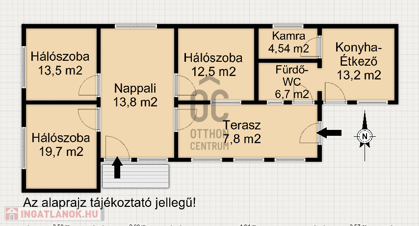 - helyiségek: 3 tágas hálószoba, nappali, fedett veranda, konyha-étkező, kamra, fürdő, külön WC