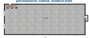 Az ingatlanhoz tartozik – az alaprajzon látható elrendezésben – egy saját, 12 m2-es, laminált padlós, klimatizált, fűthető, műanyag nyílászárókkal ellátott iroda, valamint a raktárból megközelíthető egy saját mosdó és zuhanyzó.