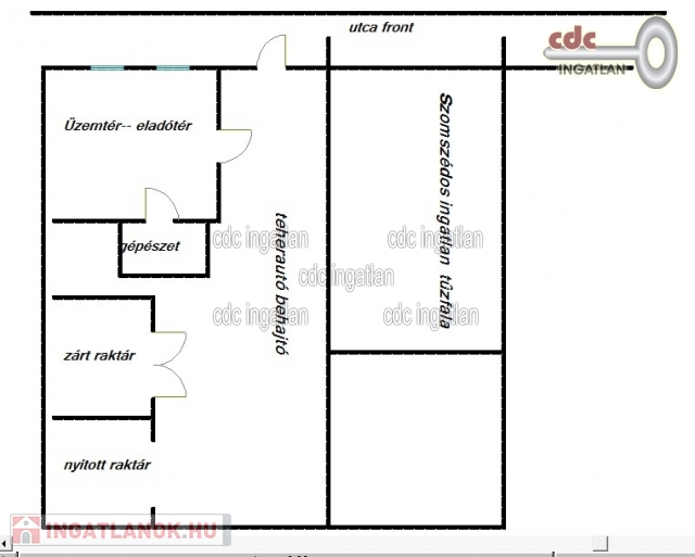 közlekedő, folyosó, üzlettér/szoba (válaszfalak nélkül). 65 m2-es tetőtér/emelet: egy légterű szoba vagy iroda. Műszaki tartalom: sávalap, szigetelt tégla falazat, monolit vasbeton födémszerkezet, műanyag nyílászárók, zsindelyes tető, gázkazán radiátorokkal. Parkolási lehetőség az udvaron belül, illetve az utcán ingyenes. A területen belül tehergépjárművel is lehet közlekedni.