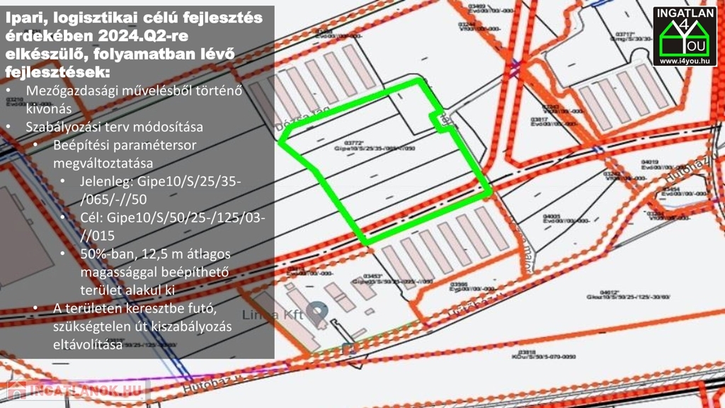 Jelenleg folyik a terület mezőgazdasági művelésből történő kivonása, valamint a rendezési terv módosítása. Aminek eredményeként 2024. második felére Ipari besorolású, 50%-ban, 12,5 m-es átlagos építménymagasággal beépíthető építési telek alakul ki.