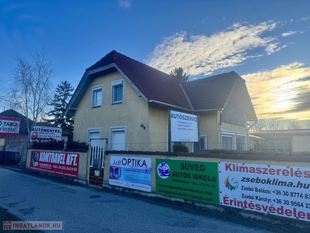 Eladó jó állapotú családi ház, mely rengeteg remek lehetőséggel bír, Komáromban, frekventált, jól megközelíthető helyen, műhellyel és bemutatóteremmel/autószalonnal. Szinte bármilyen vállalkozás megvalósítható benne.