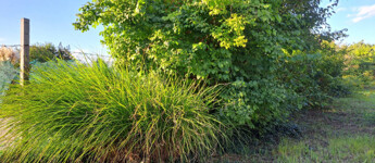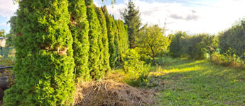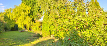 Rengeteg örökzöld, fűzfa, gyümölcsfa. A faház mögött egy művelt magaságyás lett kialakítva. Igazi "MESEKERT"!